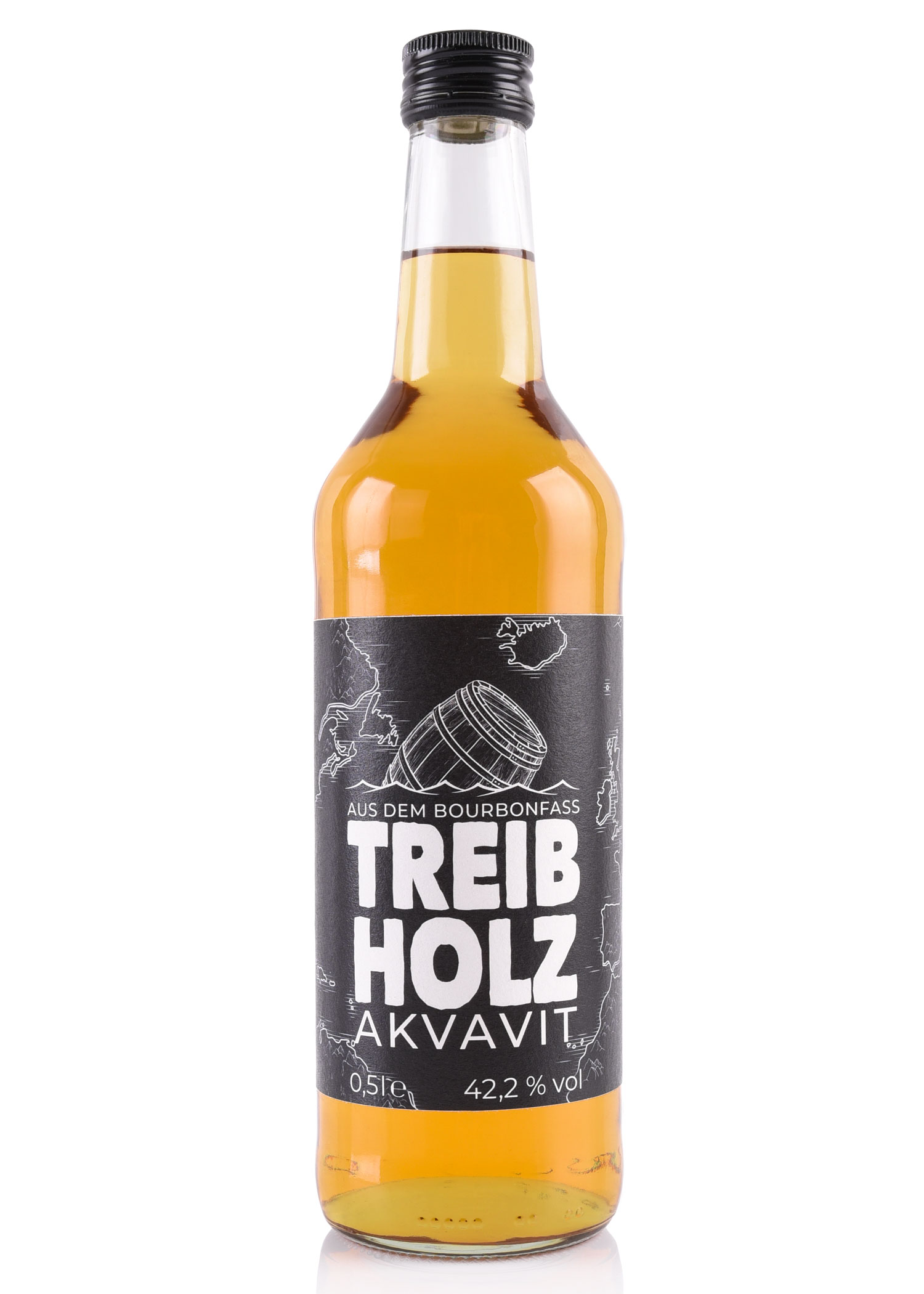 Unser Treibholz-Akvavit lagerte über zwei Jahre in Bourbonfässern der amerikanischen Whiskydestille Four Roses. Diese Fässer haben wir unmittelbar nach ihrer Entleerung quer über den großen Teich zu uns in die Elbmarsch schippern lassen und mit skandinavischem Lebenswasser befüllt. Der im Aquavit vorherrschende, typische Kümmelgeschmack ist in dieser langen Lagerzeit etwas in den Hintergrund getreten und hat sich mit den feinen Vanillie-, Nuss und Eichenholzaromen des Kentucky Bourbonfasses vermählt.